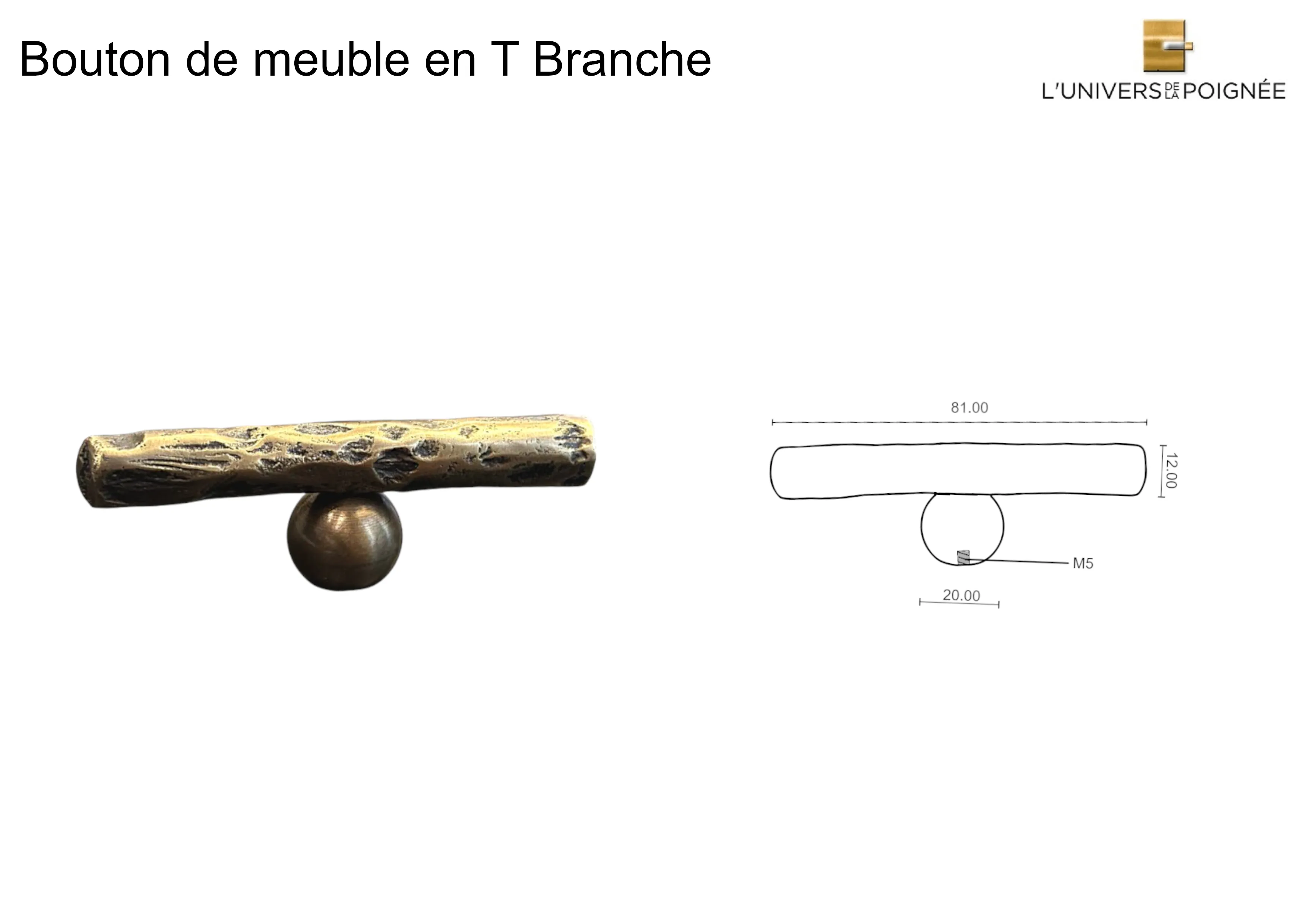 Bouton de meuble en T – Modèle BRANCHE MARTELÉE