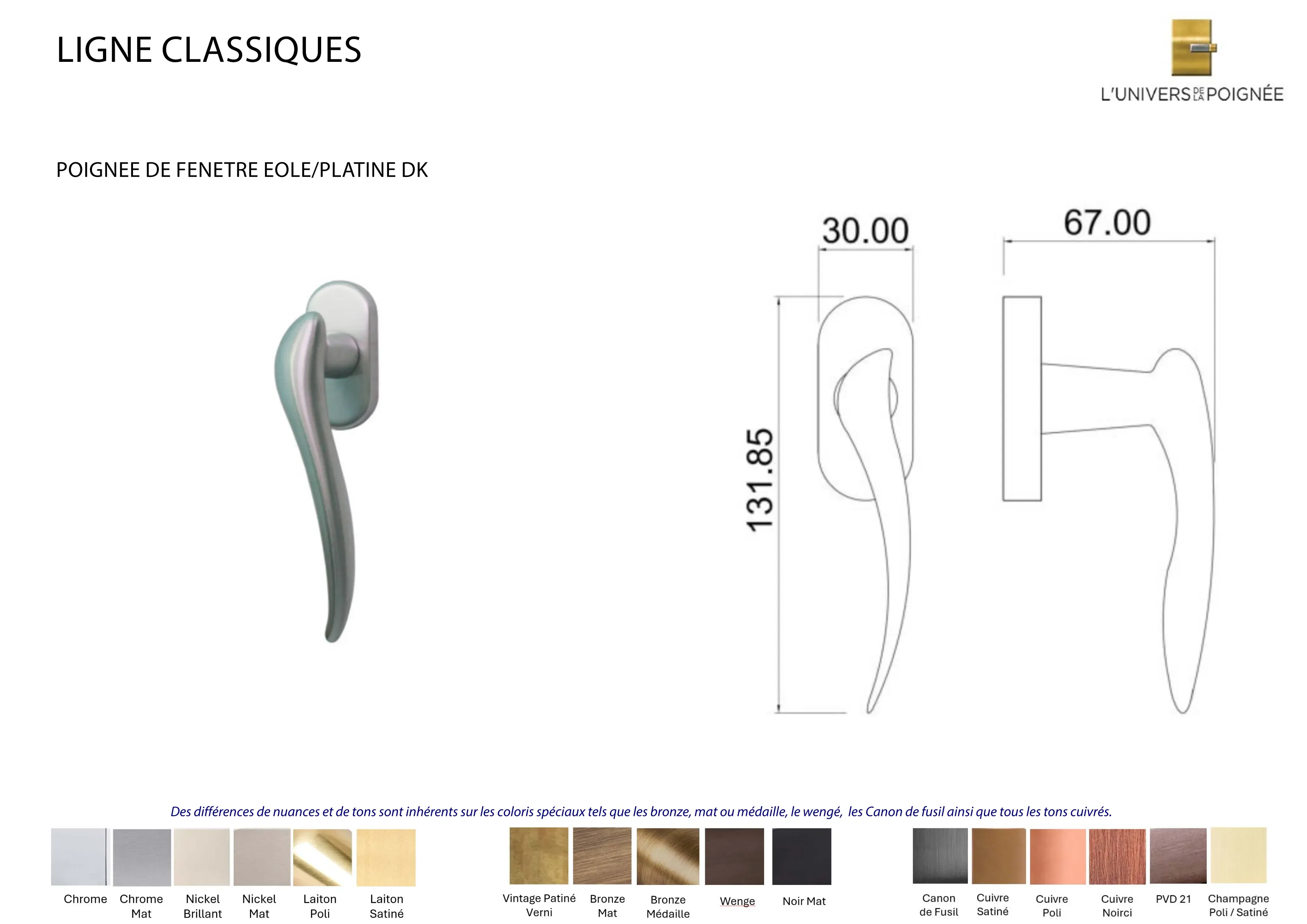 Parce que chaque intérieur mérite une finition sur mesure, la poignée de fenêtre Eole est disponible en plus de 15 coloris différents, parmi lesquels : Laiton satiné ; Laiton poli ; Chrome mat ; Chrome brillant ; Nickel mat ; Nickel brillant ; Bronze mat ; Bronze médaille ; Bronze vintage ; Wengé ; Blanc ; Noir mat ; Canon de fusil ; Cuivre satiné ; Cuivre brillant ; Cuivre noirci ; Champagne mat ; Champagne brillant