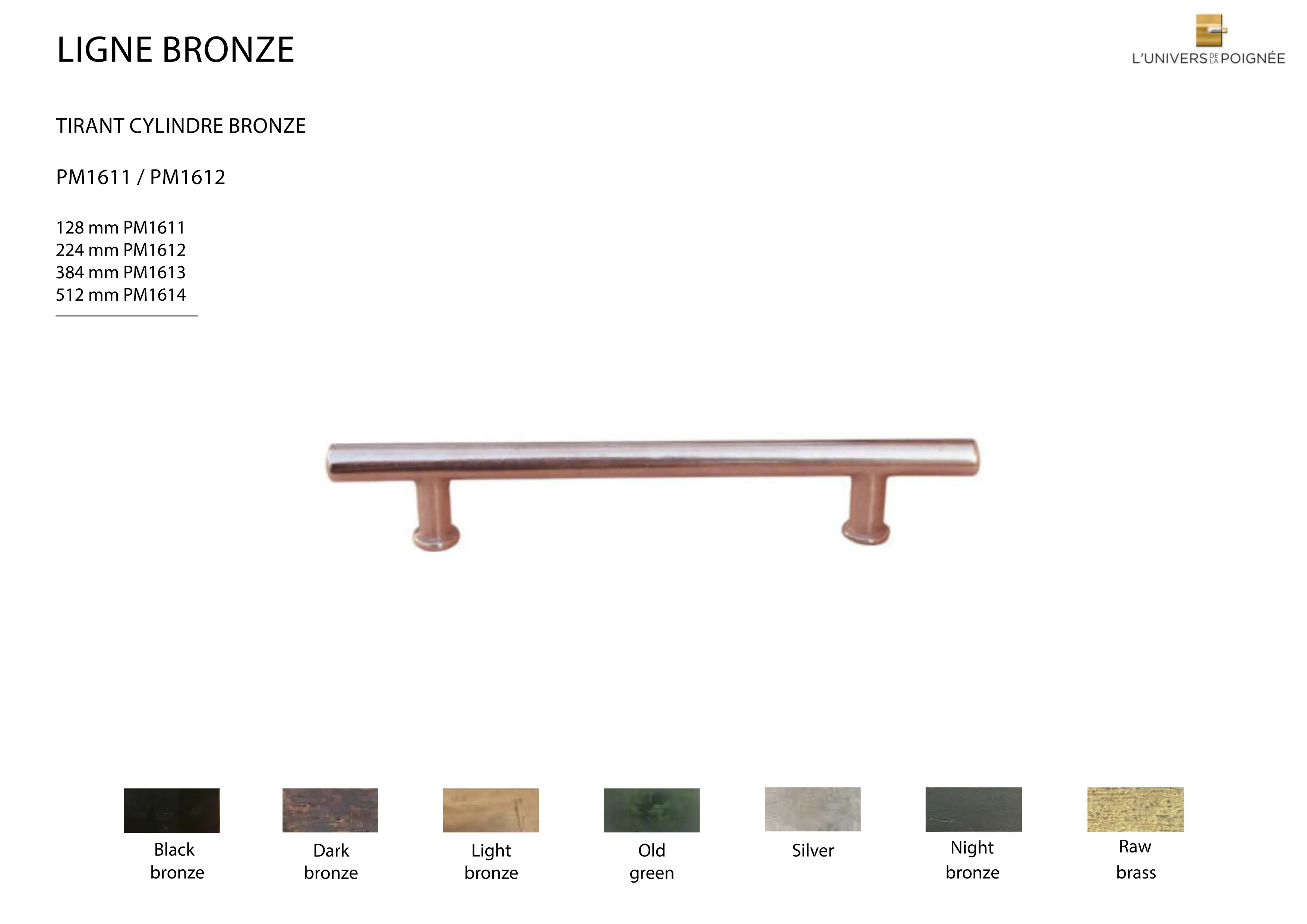Les finitions disponibles incluent : Black bronze ; Dark Bronze ; Light Bronze ; Old Green ; Silver ; Night Bronze ; Old Brass ; Nickel Brillant