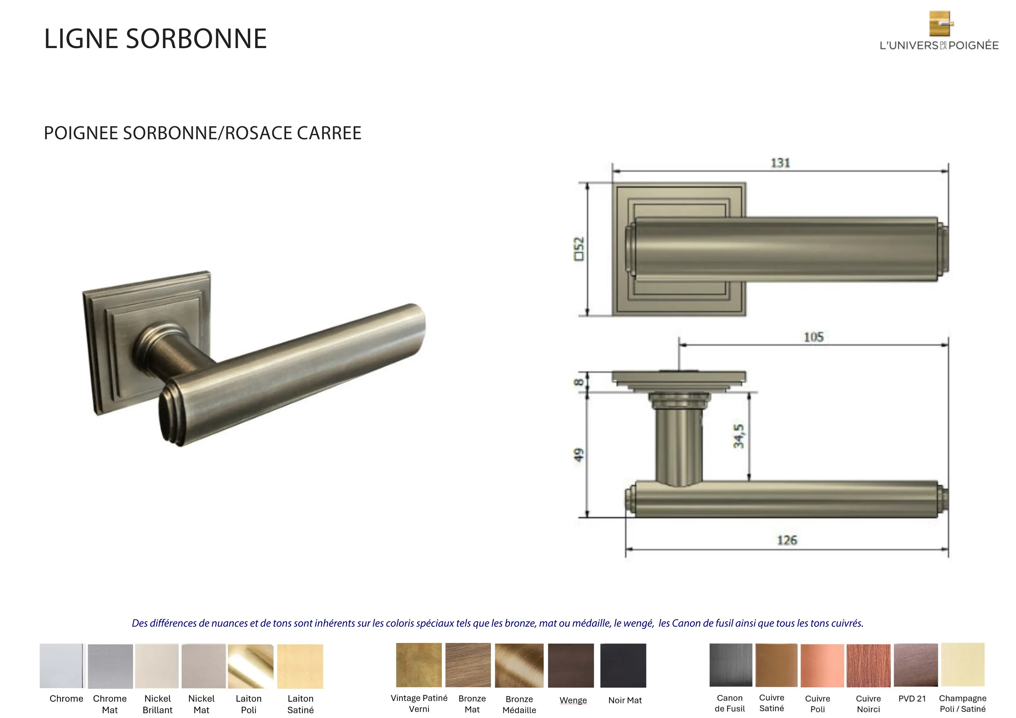 Parce que chaque intérieur mérite une finition sur mesure, la poignée de porte Sorbonne est disponible en plus de 15 coloris différents, parmi lesquels : Laiton satiné ; Laiton poli ; Chrome mat ; Chrome brillant ; Nickel mat ; Nickel brillant ; Bronze mat ; Bronze médaille ; Bronze vintage ; Wengé ; Blanc ; Noir mat ; Canon de fusil ; Cuivre satiné ; Cuivre brillant ; Cuivre noirci ; Champagne mat ; Champagne brillant