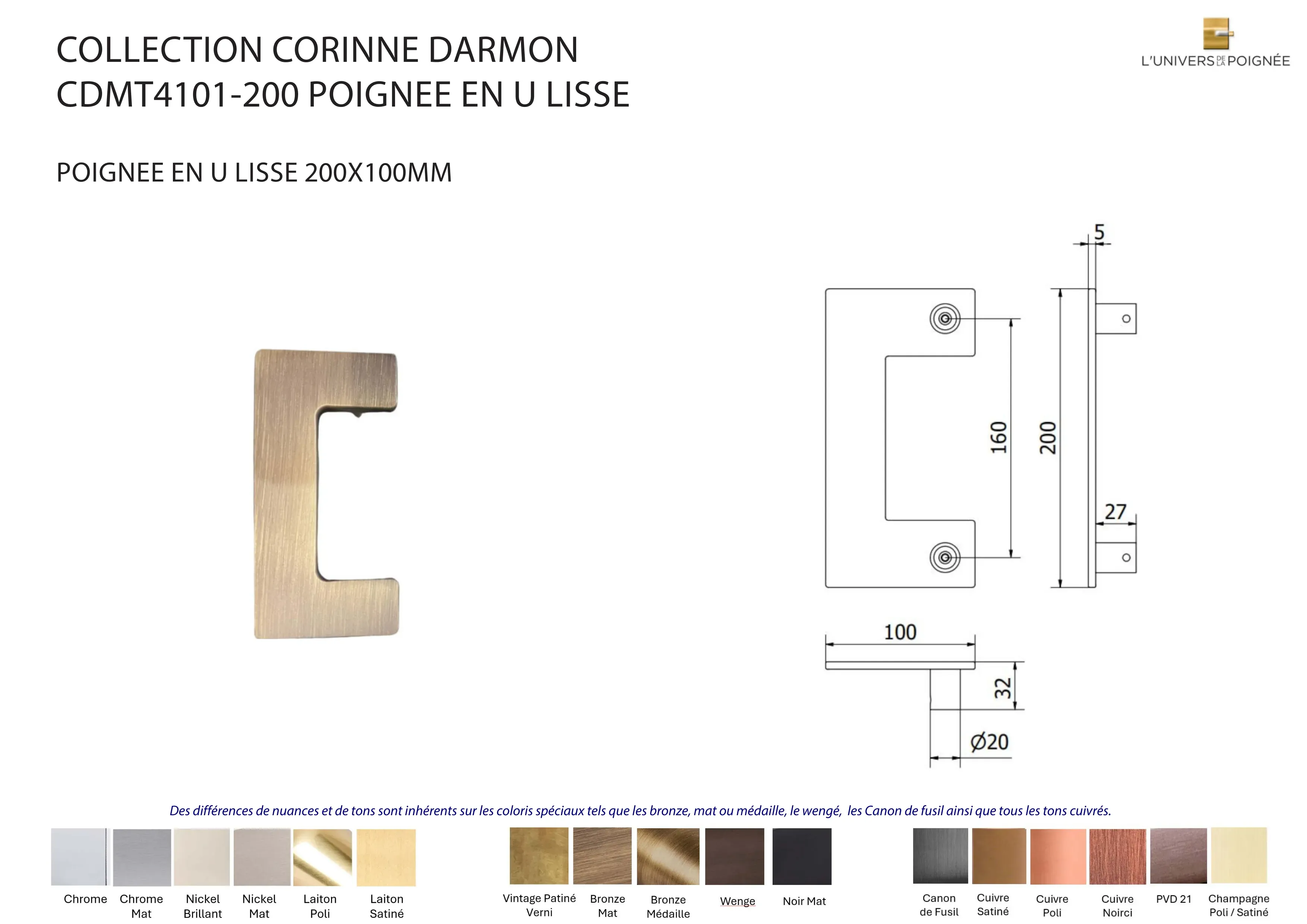 La poignée de meuble en U 200x100 mm est un modèle de tirage structuré, conçu pour apporter une touche graphique aux grandes portes et façades de meuble. Reposant sur deux pieds ronds, elle permet une fixation polyvalente adaptée à différents types d’installations.