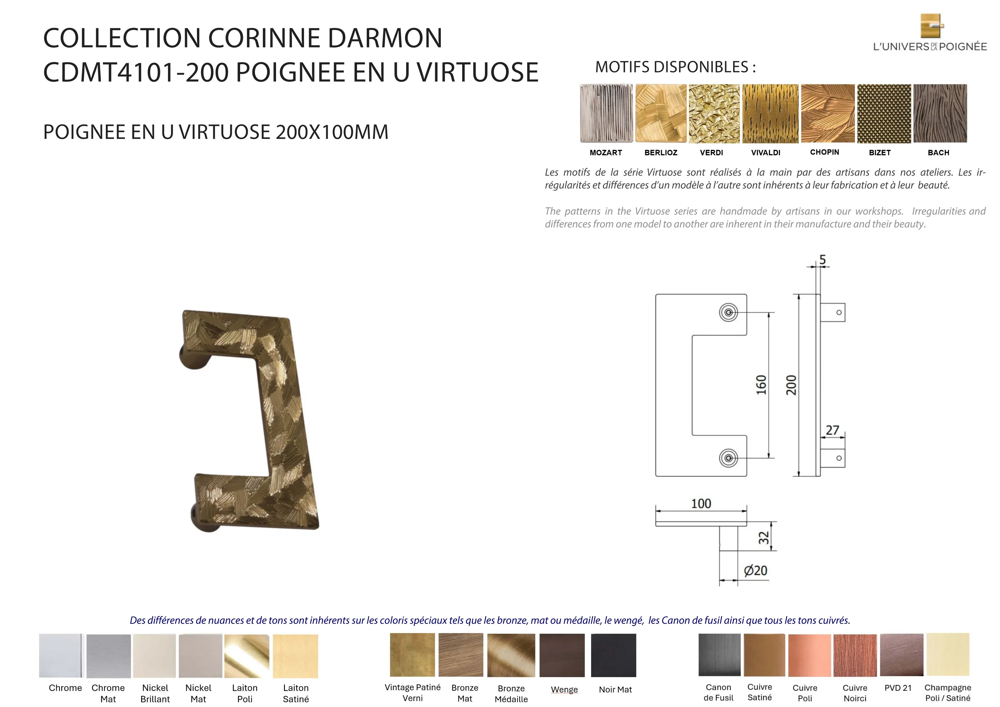 Laiton satiné ; Laiton poli ; Chrome mat ; Chrome brillant ; Nickel mat ; Nickel brillant ; Bronze mat ; Bronze médaille ; Bronze vintage ; Wengé ; Blanc ; Noir mat ; Canon de fusil ; Cuivre satiné ; Cuivre brillant ; Cuivre noirci ; Champagne mat ; Champagne brillant